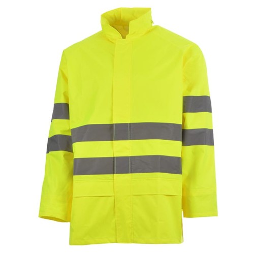 Cazadora de lluvia monocolor alta visibilidad con cremallera central, tapeta y velcros.Prenda estanca.Capucha oculta en cuello. Puños con ajustes elasticos en interior.2 bolsillos en la parte inferior con tapeta.Dos bandas reflectantes grises de 5cm.Lavado a temperatura máxima 30º - Se puede planchar a baja temperatura - No usar lejía - No permite limpieza en seco - No utilizar secadora - Max 25X.