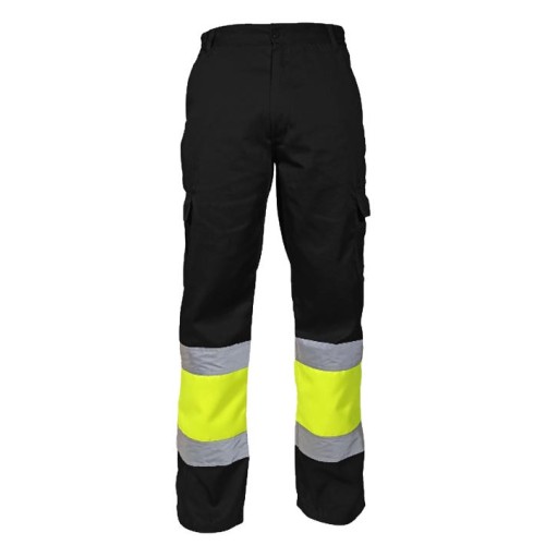 Pantalón multibolsillos de alta visibilidad combinados.Disponen de dos bandas reflectantes en color gris/plata que rodean las perneras.Las bandas llevan doble costura lo cuál las dota de un extra de sujección al tejido de los Pantalón.El modelo dispone de dos bolsillos laterales situados en cada una de las perneras, con cierre por tapeta y velcro.Dispone también de bolsillo porta monedas, dos bolsillos tipo francés y dos bolsillos traseros con cierre por tapeta y velcro.Lavado a temperatura máxima 40º - Se puede planchar a baja temperatura - No usar lejía - No permite limpieza en seco - No utilizar secadora - Max 25X.